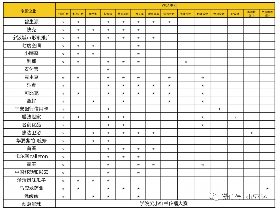 參賽作品按照學(xué)院獎(jiǎng)組委會(huì)指定廣告主提供的命題策略單進(jìn)行創(chuàng)作。命題策略單及命題企業(yè)素材文件詳見大廣節(jié)學(xué)院獎(jiǎng)官方網(wǎng)站:xyj.5iidea.com