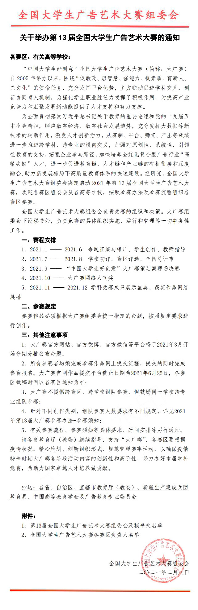 為全面貫徹落實習近平總書記關(guān)于教育的重要論述和黨的十九屆五中全會精神,順應數(shù)字經(jīng)濟、數(shù)字社會發(fā)展趨勢,充分發(fā)揮大數(shù)據(jù)等新技術(shù)的輔助作用,激發(fā)人才創(chuàng)新活力,從賽制、平臺、師資、產(chǎn)出等領(lǐng)域進一步推進跨學科、跨專業(yè)的橫向交叉,加強對原創(chuàng)性、系統(tǒng)性、引領(lǐng)性教育的支持,拓寬企業(yè)參與路徑,加快培養(yǎng)全媒化復合型廣告行業(yè)“高精尖缺”人才,進一步促進教育鏈、人才鏈和產(chǎn)業(yè)鏈的有機銜接和深度融合,助力新發(fā)展格局下高質(zhì)量教育體系的快速建設(shè)。經(jīng)研究,全國大學生廣告藝術(shù)大賽組委會決定啟動2021年第13屆全國大學生廣告藝術(shù)大賽,歡迎各賽區(qū)組委會及各高等學校,按照參賽辦法及參賽流程組織各賽區(qū)參賽。現(xiàn)將有關(guān)事宜通知如下: