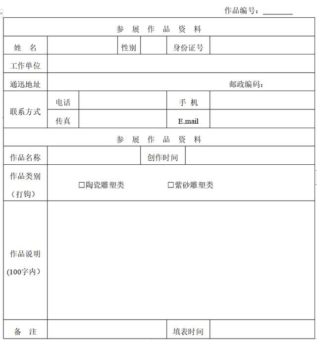 1.每件(套)作品需單獨填寫參評表;2.每件(套)作品的作者一般不超過2人;3.寄送表格時需附作品高像素照片;4.此表請于2020年5月22日前發(fā)送至157256839@qq.com,實物作品于2020年5月28日送到德化縣陶瓷博物館二樓,逾期不再接收。
