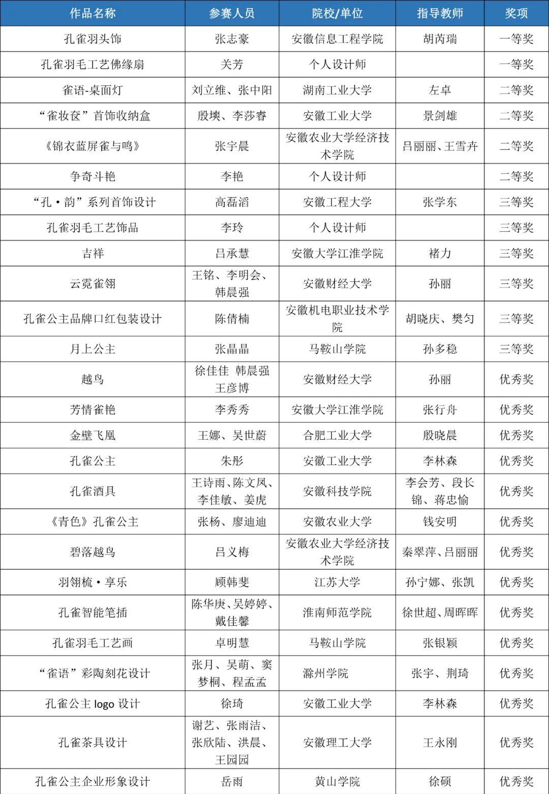 根據(jù)評審結(jié)果,現(xiàn)將安徽省第七屆工業(yè)設(shè)計大賽“孔雀公主杯”新銳時尚工藝品專項賽獲獎名單予以公示。公示時間為2020年10月9日至2020年10月11日。公示期間,任何單位或個人對獲獎作品有異議,可以實(shí)名書面或電子郵件形式向大賽組委會辦公室反映,并提供相關(guān)證實(shí)材料。