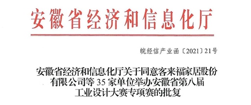 2021年2月2日,安徽省經(jīng)濟(jì)和信息化廳《關(guān)于同意客來(lái)福家居股份有限公司等35家單位舉辦安徽省第八屆工業(yè)設(shè)計(jì)大賽專項(xiàng)賽的批復(fù)》(皖經(jīng)信產(chǎn)業(yè)函〔2021〕21號(hào))正式下發(fā),專項(xiàng)賽數(shù)量再創(chuàng)新高。