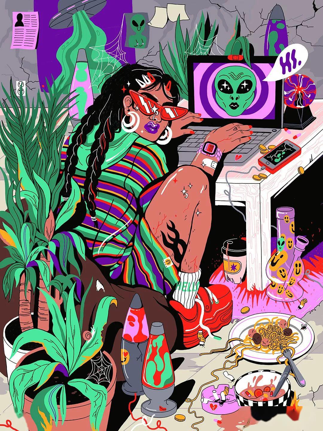 他們生活在一個(gè)密集細(xì)致的世界里,充滿了各種現(xiàn)代事物:快餐、飲料、智能手機(jī)、電子科技、香煙......一個(gè)消費(fèi)的世界,通過物品表達(dá)身份。大部分畫中的主角是女孩,充斥流行文化和搶眼色彩的畫面,展現(xiàn)了閃耀的叛逆。