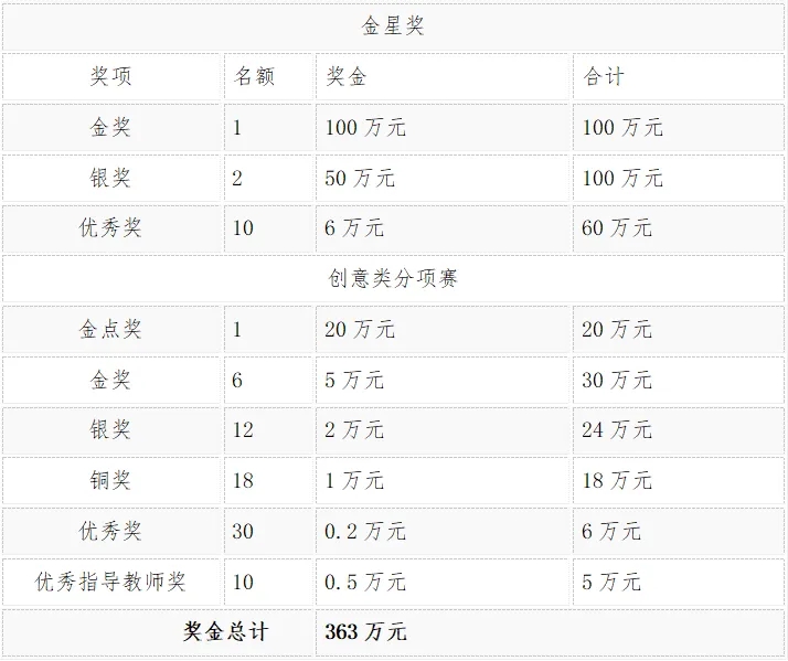1.大賽設(shè)金星獎(jiǎng)金獎(jiǎng)1項(xiàng)、銀獎(jiǎng)2項(xiàng)、優(yōu)秀獎(jiǎng)10項(xiàng);創(chuàng)意類金點(diǎn)獎(jiǎng)1項(xiàng)、金獎(jiǎng)6項(xiàng)、銀獎(jiǎng)12項(xiàng),銅獎(jiǎng)18項(xiàng),優(yōu)秀獎(jiǎng)30項(xiàng),入圍獎(jiǎng)若干,優(yōu)秀指導(dǎo)教師獎(jiǎng)10項(xiàng)。