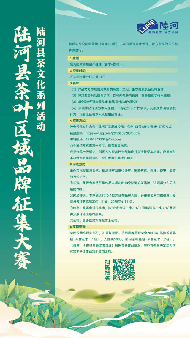 ②電子郵件:18751849300@126.com(文件命名:陸河好茶品牌投稿:名字+口號(hào)+單位/作者+聯(lián)系方式)