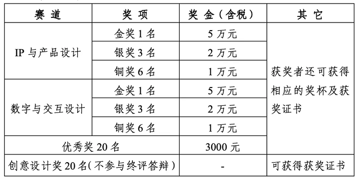 大賽設(shè)金獎(jiǎng)2名、銀獎(jiǎng)6名、銅獎(jiǎng)12名,優(yōu)秀獎(jiǎng)20名,創(chuàng)意設(shè)計(jì)獎(jiǎng)20名(入圍獎(jiǎng)、不參與終評答辯)。共60個(gè)獎(jiǎng)項(xiàng),獎(jiǎng)金合計(jì)40萬元。