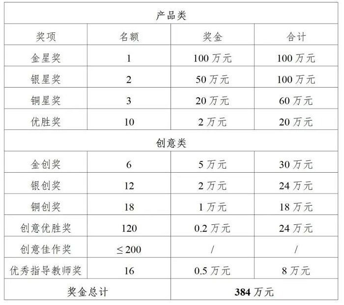 1.五金獎(jiǎng)設(shè)產(chǎn)品類賽道金星獎(jiǎng)1項(xiàng)、銀星獎(jiǎng)2項(xiàng)、銅星獎(jiǎng)3項(xiàng)、優(yōu)勝獎(jiǎng)10項(xiàng);創(chuàng)意類賽道金創(chuàng)獎(jiǎng)6項(xiàng)、銀創(chuàng)獎(jiǎng)12項(xiàng)、銅創(chuàng)獎(jiǎng)18項(xiàng)、創(chuàng)意優(yōu)勝獎(jiǎng)120項(xiàng)、創(chuàng)意佳作獎(jiǎng)不超過200項(xiàng),優(yōu)秀指導(dǎo)教師獎(jiǎng)16名。獎(jiǎng)金總額384萬元。