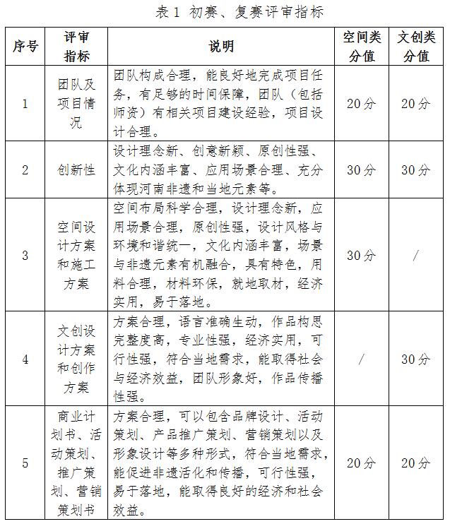 “黃河之村”(空間類)項目和“黃河之禮”(文創(chuàng)類)項目初賽、復(fù)賽評審指標(biāo)與分值參見表1,決賽評審指標(biāo)與分值參見表2。