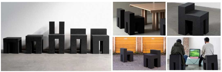 這款系列凳的設(shè)計在結(jié)構(gòu)和椅子中取得了很好的平衡,完全采用聚氨酯泡沫UP40作為材料,呈現(xiàn)出四邊形的盒子形狀。乍一看,你會以為是混凝土,然而它卻非常的輕,十分有趣又很友好,將美學(xué)、形式、設(shè)計融為一體——柔軟的幾何圖案、雕塑似的外觀、耐久性。這款系列凳靠背高低不同,有的高,有的低,甚至有的沒有靠背,更像是一個臺凳,但均能作為凳子來使用。