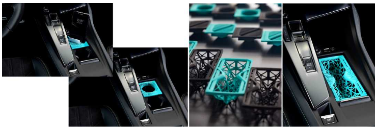 Peugeot新款308汽車是3008SUV的迭代版,其創(chuàng)新的內(nèi)飾儲物槽為3D打印,采用熱塑性聚氨酯彈性體(TPU)作為材料,具有橡膠一般的彈性和塑料一般的耐久性。這款定制的儲物槽具有不同的功能,比如作為手機支架、太陽鏡盒子、杯子支架等。設(shè)計的合作方還包括HP Inc.、M?der、ERPRO、BASF。