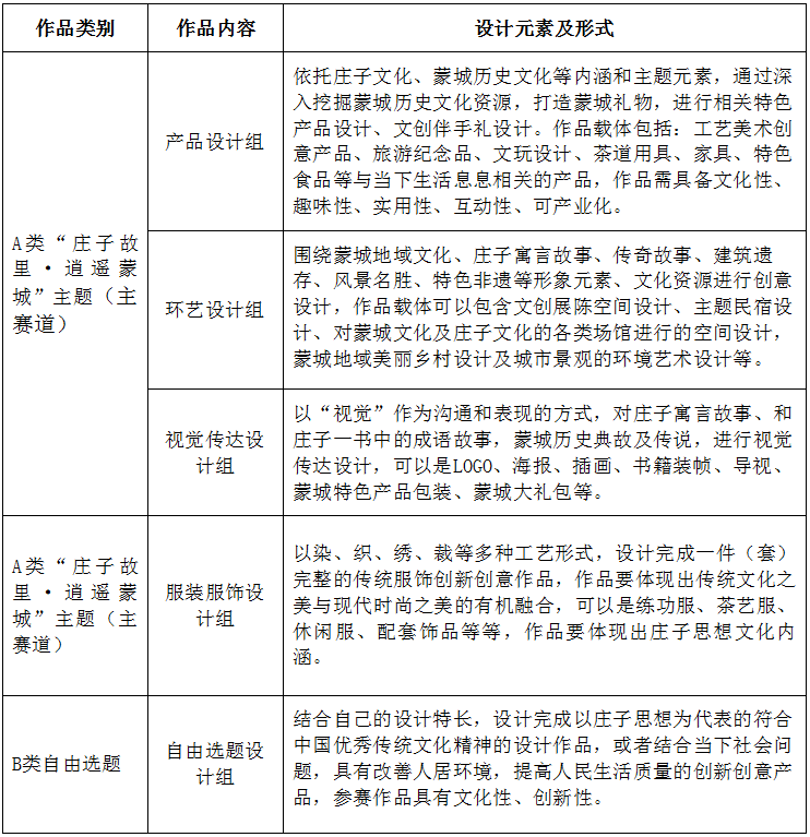 本次大賽參賽作品類別分為A類(“莊子故里·逍遙蒙城”主題)、B類(自由選題)兩種。具體要求參照表6-1。