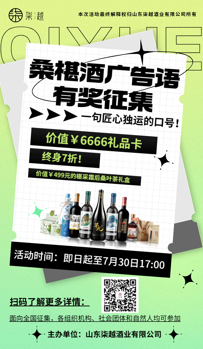 一句匠心獨運的口號,將會為柒越酒業(yè)的營銷之路吹響號角,為桑椹酒的宣傳蓄勢賦能,望各位踴躍參與!