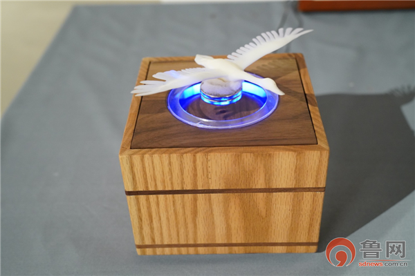 嘉賓們或不時駐足觀賞,或依次細細打量,或零距離體驗高科技的衍生品,大天鵝獨有的魅力深深吸引了眾人。一件名為《獨舞凌波》的絲綿畫作品做吸引了現(xiàn)場觀眾的目光,作品中,一只大天鵝游憩在水中,精心選用的絲綿材質(zhì)賦予了天鵝白羽生動的立體感,展現(xiàn)了大天鵝的優(yōu)雅,讓人禁不住想撫摸一下栩栩如生的海邊仙子。利用磁懸浮技術理念的《天鵝夜燈》前也聚集了很多觀眾,小夜燈利用磁鐵同性相斥的特點將天鵝懸浮在空中,展現(xiàn)著大天鵝自由不被束縛的?!敖裉炜戳撕芏喔筇禊Z有關的創(chuàng)意作品,除了常見的茶具、燈具、剪紙之外,還有音響、曲別針、衣架、飛行棋等形式。真沒想到,榮成的老朋友大天鵝可以有這兒多千姿百態(tài)的展現(xiàn)形式。真是開眼界了!”現(xiàn)場觀眾不禁贊嘆!