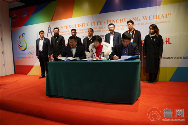 活動現(xiàn)場,歌爾集團、榮成好運角文化旅游有限公司與威海金鑲玉工藝品有限公司負責人簽訂文創(chuàng)產(chǎn)品開發(fā)合作框架協(xié)議。