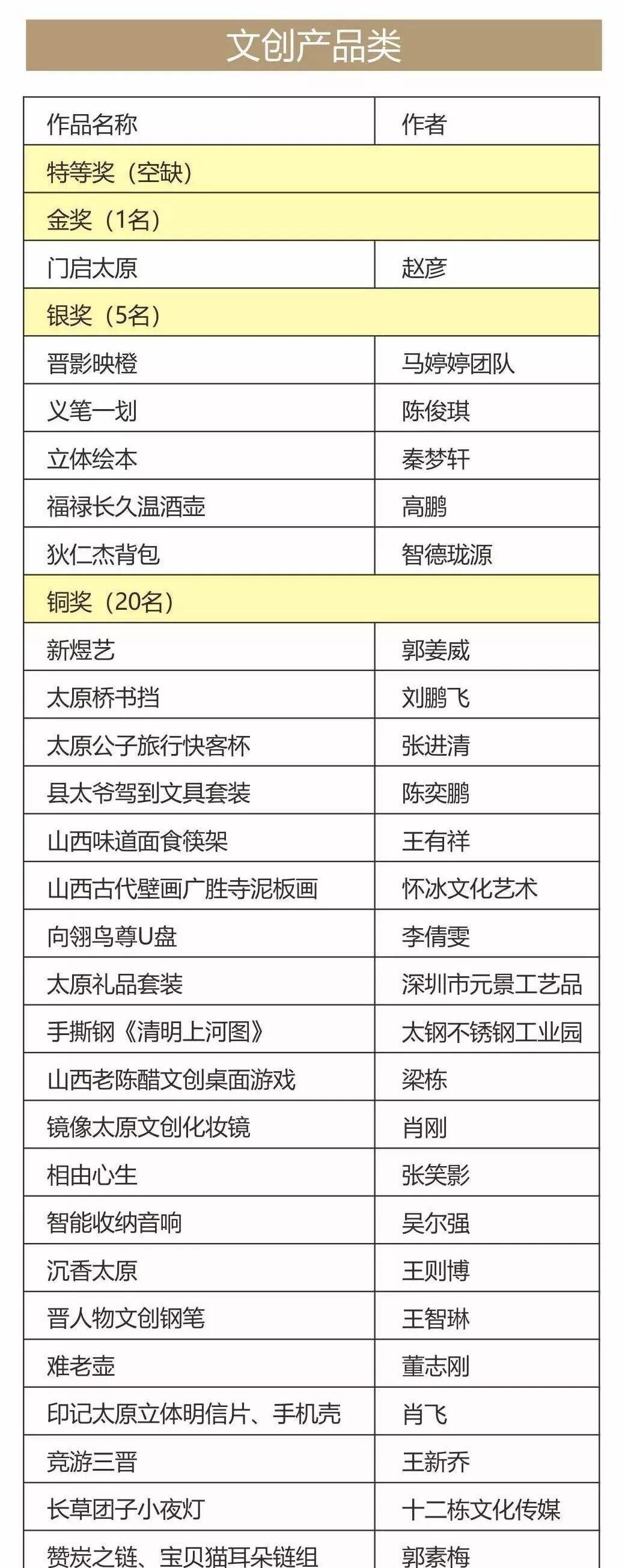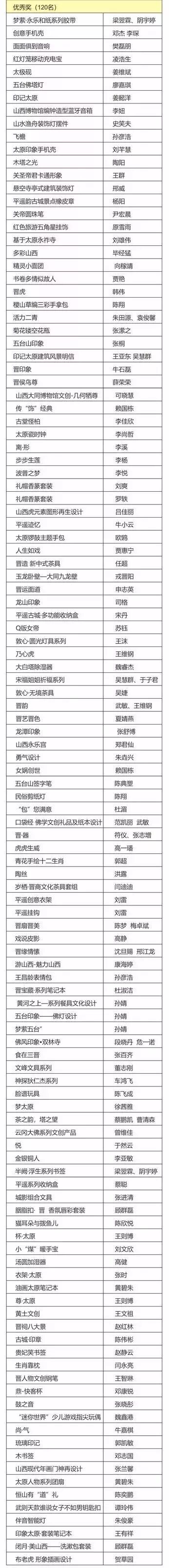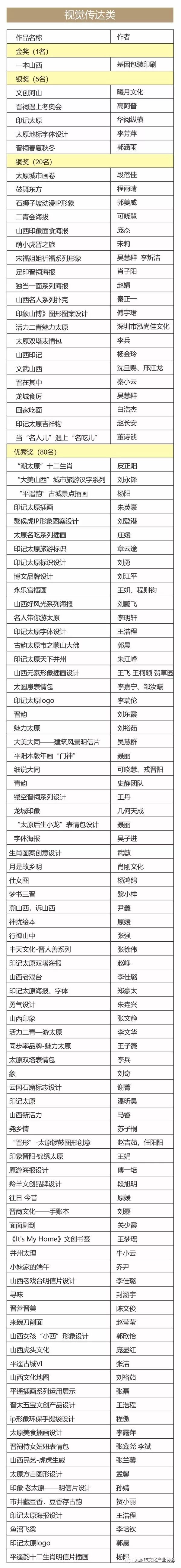 由中共太原市委宣傳部,太原市文化和旅游局主辦,太原市文化產(chǎn)業(yè)協(xié)會承辦的“印記太原”國際創(chuàng)意設(shè)計(jì)大賽共收到參賽作品3429件,分為文創(chuàng)產(chǎn)品類;特產(chǎn)禮品類;視覺傳達(dá)類三大版塊,獲獎名單公示如下: