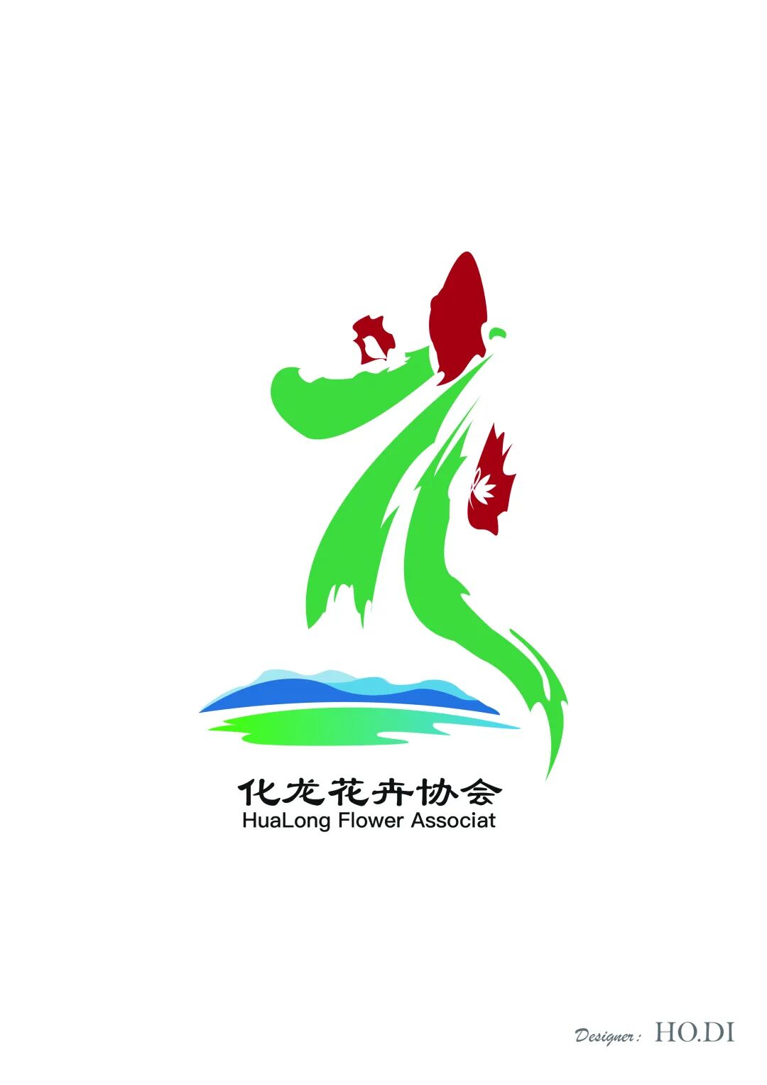2.標識內部由漢字化”融合“花卉、祥龍、組帶和山水“等元素構成”花“字,形象直觀表達出化龍鎮(zhèn)花卉協(xié)會的品牌形象和人文精神。