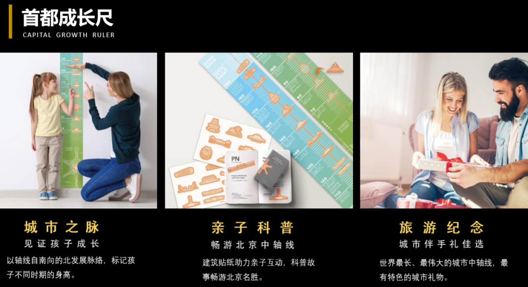 項(xiàng)目簡(jiǎn)介:《首都成長(zhǎng)尺》以中軸線自南向北的脈絡(luò),帶父母與孩子一起暢游北京中軸線沿途著名建 筑景觀,感受北京城市發(fā)展不同時(shí)期留下的印記,并標(biāo)記不同成長(zhǎng)階段的身高?!妒锥汲砷L(zhǎng)尺》具有科普教育與親子互動(dòng)的雙重價(jià)值。不同于普通身高尺,這款成長(zhǎng)尺配 有建筑圖案貼紙,父母可以一邊與孩子貼著貼紙,一邊為他們講述貼紙旁的科普故事。讓城市之脈見(jiàn)證孩子的成長(zhǎng)。