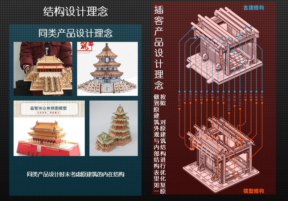 項(xiàng)目簡(jiǎn)介:此次參賽的系列產(chǎn)品的設(shè)計(jì)原型為北京市中軸線上的古代建筑。分別是天壇公園的“祈年殿”和“齋宮垂花門(mén)”、前門(mén)大街上的“正陽(yáng)橋牌樓”、景山公園的“萬(wàn)春亭”。所有的產(chǎn)品設(shè)計(jì)并非簡(jiǎn)單模仿建筑外觀,而是還原中國(guó)古建的榫卯理念、建筑結(jié)構(gòu)、比例尺度、文化特征等。所有零件級(jí)級(jí)咬合、級(jí)級(jí)互鎖,最終將所有零件咬合成一個(gè)整體。在拼插過(guò)程中無(wú)需膠水及工具,結(jié)構(gòu)牢固,如同魯班鎖。在感受動(dòng)手樂(lè)趣的同時(shí),感受中國(guó)古建文化的博大精深。