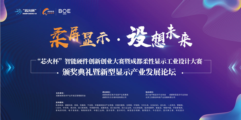 2019 年 8 月 15 日-16 日,由工業(yè)和信息化部軟件與集成電路促進(jìn)中心指導(dǎo),成都高新技術(shù)產(chǎn)業(yè)開發(fā)區(qū)管理委員會(huì)主辦,成都高新區(qū)電子信息產(chǎn)業(yè)發(fā)展局、成都京東方光電科技有限公司承辦的「柔屏顯示 『設(shè)』想未來 『芯火杯』智能硬件創(chuàng)新創(chuàng)業(yè)大賽暨成都柔性顯示工業(yè)設(shè)計(jì)大賽」決賽以及頒獎(jiǎng)儀式將于成都舉行,活動(dòng)同期還將舉行新型顯示產(chǎn)業(yè)發(fā)展論壇,圍繞當(dāng)下新型顯示產(chǎn)業(yè)市場分析、最新機(jī)遇與挑戰(zhàn)、全球融合與發(fā)展等話題展開討論,屆時(shí)將有百余名業(yè)內(nèi)人士、嘉賓及媒體出席。
